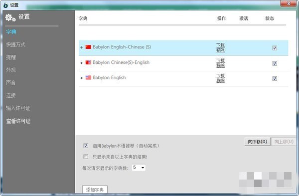 在这里,您可以看到所有已安装的词典供联机和离线使用。