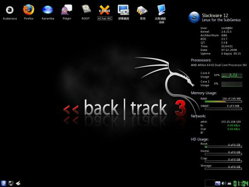 BackTrack3简称bt3,是一款体积小巧、易于携带的linux系统,使用过的用户们,想必有一定的了解,它的功能非常强大,支持多种启动方式,比如U盘启动,光盘启动,硬盘启动等等,不光如此,在安全方面也是毋庸置疑的,内置了大量的网络安全检测工具及黑客破解软件。