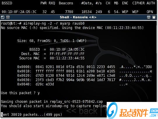 其中“targetnet”表示破解目标网络名,00:1A:01:8D:C3:B2前面已解释过是指目标MAC物理地址,00:A1:C1:D8:A5:B6表示本机网卡MAC物理地址