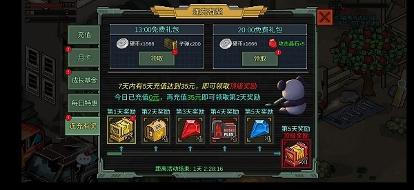 玩家无需充值,每天有两次领取奖励的机会。在13:00登录游戏,可领取1666银币与200子弹;于20:00登录游戏,就能领取1666银币和5个攻击晶石。