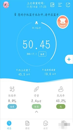 渐轻APP基于智能蓝牙秤设备辅助您进行体重称量、记录和管理。通过APP结合蓝牙秤智能硬件,您可以管理您的体重、体脂、身体水分、肌肉含量等多项参数,全面关爱您的健康。APP以体重管理为出发点,结合您的体重体征信息,给出合理的运动、饮食和睡眠指引方案,协助您管理体重、积极活动、健康饮食、睡得更好,全天候记录管理您的健康情况。