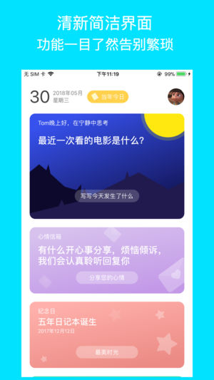 ● 五年日记本app清新简洁界面,功能一目了然,不再烦恼如何使用;● 每天问题不同,回答每天的问题或随心自由书写;
