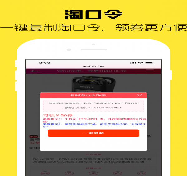 省钱优惠券app每天免费为大家提供各种商品的优惠券信息,帮您在购物的时候省钱,省一点便赚一点。每天更新成千上万款带有内部优惠券的商品,内部优惠券无条件使用,券后超低价格。本软件无须注册,打开即可使用,优惠券所提供淘口令需与手机淘宝配合使用。
