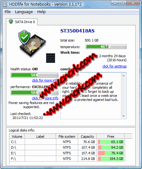 HDDlife for Notebooks V3.1.172 英文官方安装版 hddlife 是一款专业的硬盘监控工具,它与一般的硬盘监控软件不同,它所监控的并不是硬盘的容量变化,而是硬盘的健康状态。它通过硬盘的 s.m.a.r.t. 技术,帮助使用者即时反馈硬盘的健康状况以及温度等信息,让使用者能够确实掌握硬盘的实时状态,从而决定硬盘中数据的备份和硬盘更换计划,避免因硬盘损坏而造成的资料损失。hddlife 以托盘方式将监控信息直接显示于各个硬盘图标上,同时 hddlife 还提供了通过网络和电子邮件通知用户的远程管理功能,使你的管理监控工作更加方便。