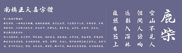 南构王天喜字体是由王天喜先生手写的一款全新中国风字体工具。这款南构字体采用毛笔书写,字体端正大方,整体风格儒雅,给人一种得体的印象,适用于各种书籍印刷、海报设计等。