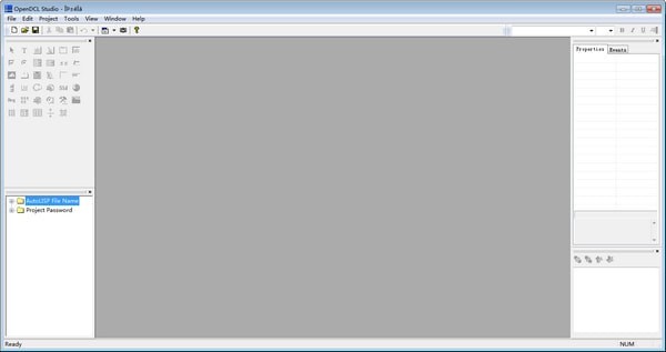 最后一个菜单项用来移除窗口,下拉菜单Tools的CopyEnents To C lipboard Pro ject和 Copy Enents To L isp F ile菜单项也非常重要,经常会用到,主要是把OpenDCL自动生成的Lisp语句复制到剪贴板或者相关联的Lisp文件中。在OpenDCL窗体的左侧,上面是控件工具箱(TooBox),OpenDCL提供多达35种控件可供使用,下面是工程结构树窗口(Pro jectTree)。在ObjecDCL窗体的右侧,上面是对话框控件属性(Properties)和事件(Events)窗口,下面是控件上下次序显示调整窗口(Z/Tab Oder)。ObjecDCL窗体的中间,就是摆放新创建的对话框的位置了,各工具栏和停靠栏位置是可以随意托动调整的。如下图所示: