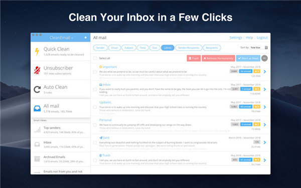 CleanEmailMac版可以删除,存档,移动,标签分类组的电子邮件,无需一个个邮件单独处理。它将所有电子邮件组织成易于查看的包,以简化电子邮件管理。使用电子邮件自动执行任何操作。退订功能