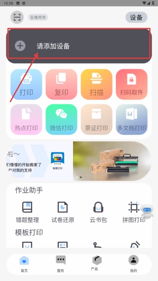 1. 开启打印功能,点击“请添加设备”按钮,进入添加打印机功能的页面。