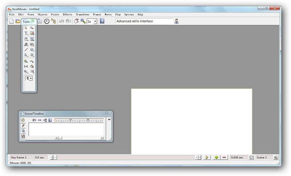 随着Flash动画在网络上的大受欢迎,Flash 软件家族也跟着发展壮大起来,我们会见到许多出色的第三方动画软件,Koolmoves 就是其中的一个皎皎者。它不仅能做出 Flash 动画,同样也可将动画输出为动态 GIF 格式或是其他常用的动态格式。此软件包括了丰富的做图工具和文字工具,而且也允许将图像,声音等其他的外部文件导入进行编辑。