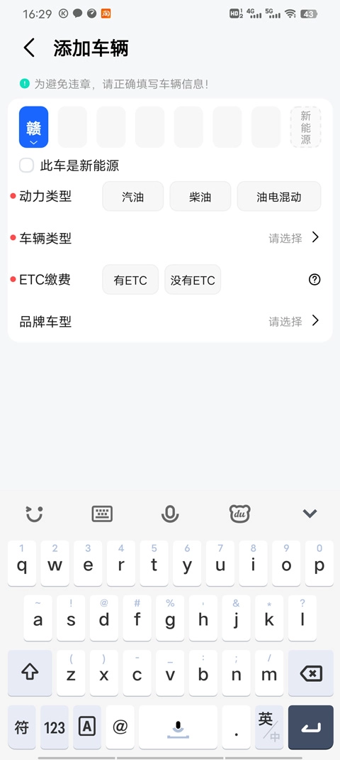 2. 填入车牌号、汽车类型、品牌以及是否有ETC等信息,然后点击“完成”。