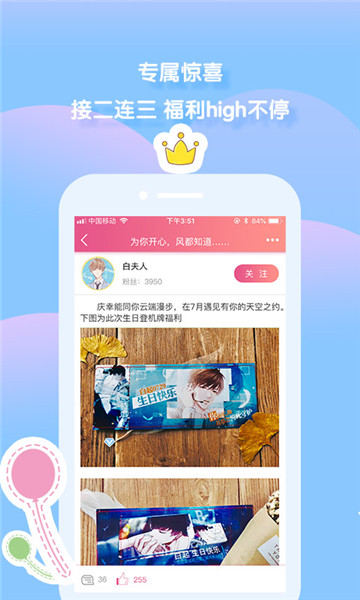 1、打CALL服务:线上支持开机屏、Banner、站内公告、活动等曝光推广,还可以每日任务,提升偶像的知名度!