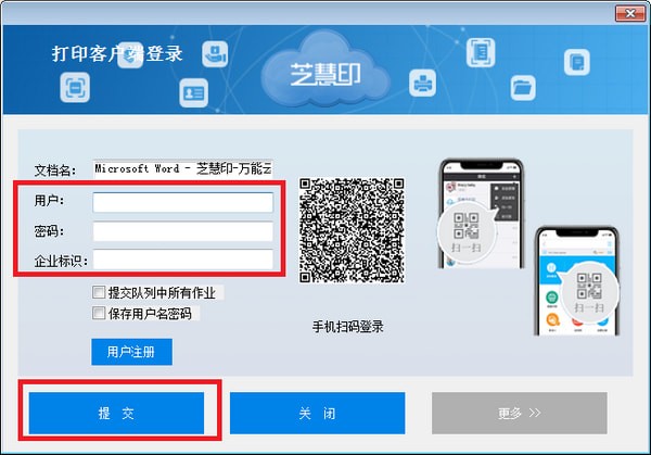 请输入您的用户名、密码、企业标识,或者使用手机进行扫码登录;身份信息确认完成后,点击“提交”按钮,即可将文件提交到云端。