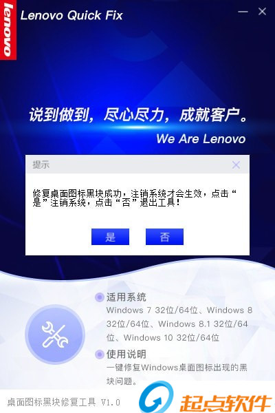 步骤2:点击“修复桌面图标黑块”运行工具,执行结束后,系统会提示“修复成功,需注销系统后生效的信息”,如图3所示: