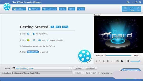 Tipard Video Converter Ultimate可让您将1080p高清格式设置为配置文件,并将DVD /视频转换为各种3D格式,以便您可以沉浸式地观看喜爱的电影。 3D配置文件包括MP4并排3D视频(* .mp4),MP4顶部和底部3D视频(* .mp4),MP4立体3D视频(* .mp4),MKV并排3D视频(* .mkv), MKV顶部和底部3D视频(* .mkv),MKV立体3D视频(* .mkv)等