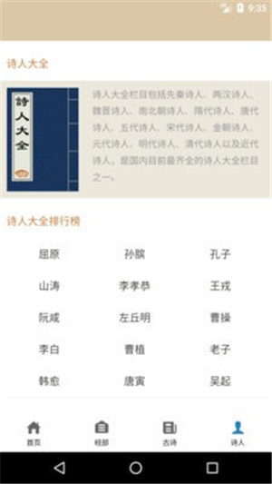 诗人:诗人大全栏目包括先秦诗人、两汉诗人、魏晋诗人、南北朝诗人、隋代诗人、唐代诗人等等