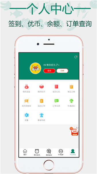 3.内嵌手机淘宝模块,一键免费领取优惠券并跳转至手机淘宝对应商品下单。需先登陆手机淘宝账号,下单时自动使用内部优惠券。所有已购买订单在淘宝、支付宝APP中均可查询订单详情。