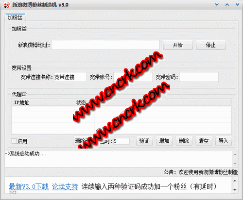 新浪微博粉丝制造机:填入需要加粉丝帐号的微博首页地址,设置好宽带帐号或者代理ip 点开始按钮 跳出验证码窗口 输入验证码就能制造粉丝 制造的粉丝有头像有资料有博文自有粉丝 它的粉丝也会增加 真实度99% 成功制造粉丝后自动加入网络后台 就算不在线不使用软件粉丝也会继续增加一段时间 长时间不输入验证码制造粉丝,增加粉丝将会停止 软件为免费软件,不需要任何费用,没有任何限制,放心使用!软件采用多线程 出验证码的时间更短 制造粉丝的速度更快。制造粉丝需要换ip,adsl用户可以设置宽带帐号重拨号换ip,局域网用户可以设置代理ip,软件有验证代理ip有效性功能!