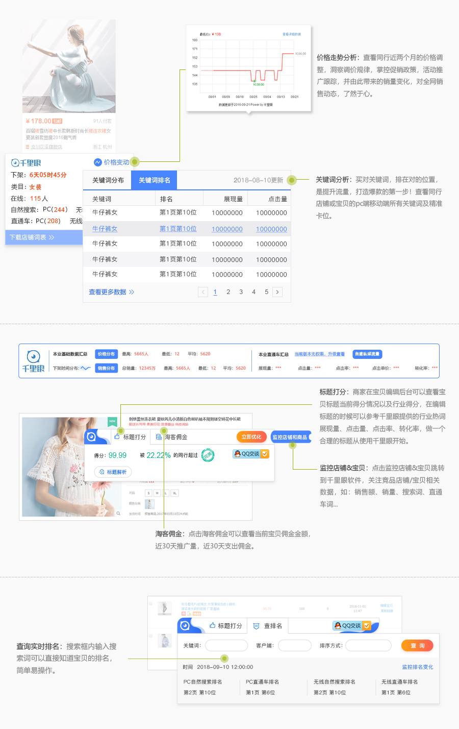 千里眼插件 是在淘宝官网搜索页面上直观的展示每个宝贝的上下架时间、PC端在线人数、宝贝的关键词排名、展现量、点击量,宝贝的价格变化曲线等汇总数据淘宝详情的页面上: 直观的展示宝贝的上下架时间、PC端在线人数、实时排名查询、关键词排名,标题打分,淘客佣金,全网淘词等等。