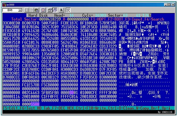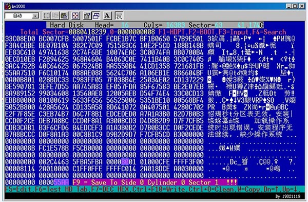 3、然后按键盘page down翻页,我按了8次出现以下界面,须要出现“80”“55AA”标志,因为这是引导标记,地址是0-0000000008