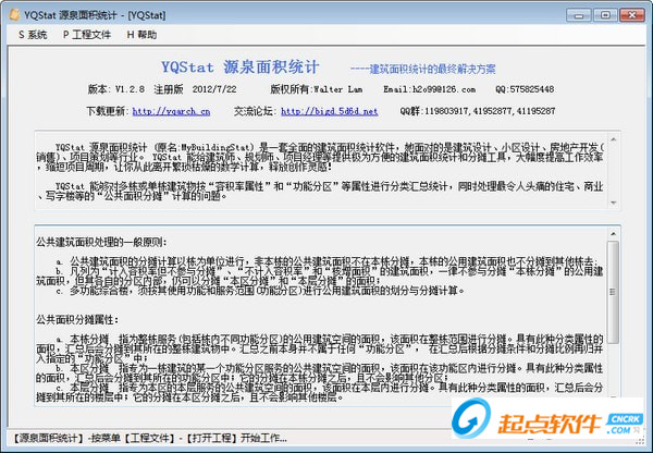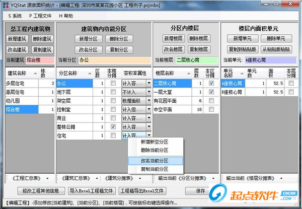 YQStat 能够对多栋或单栋建筑物按“容积率属性”和“功能分区”等属性进行分类汇总统计,同时处理最令人头痛的住宅、商业、写字楼等的“公共面积分摊”计算的问题;用于汇总分类的“功能分区”等是可任意增加的,如“住宅”、“写字楼”、“架空层”、“控制室”、“小学”等;