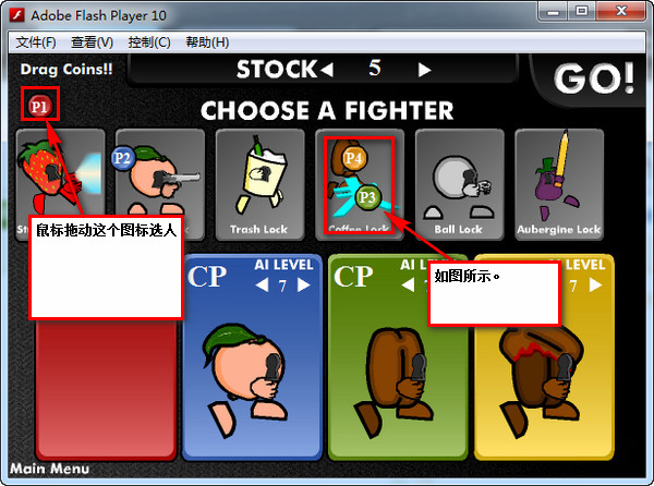 疯狂小人战斗,一款支持最多四人同台竞技的小游戏,但是很多网站都没有提到怎么样进行四人游戏,也没有人说4人同台游戏的时候,操作方法是怎么样的,在这里,小编告诉你答案!点击进入游戏:疯狂小人战斗。想要了解疯狂小人战斗4人的操控方法,先必须知道怎么进行四人游戏:四人游戏模式选择:游戏加载→点击【PLAY】→点击任意键→点击【Multi P Mode】→点击【VS Mode】→拖动P1、P2、P3、P4到喜欢的人物上(有几位玩家选择几人),点击【GO】→选择场景,开始游戏!