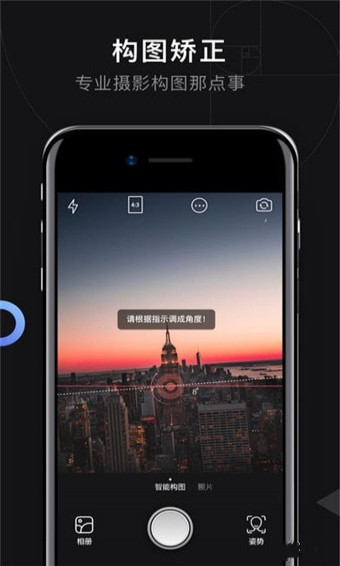 取景框中会自动出现水平辅助线,调整相机的水平位置与辅助线重合拍出完美照片
