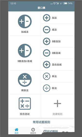 爱口算app支持以下类型口算题:加法、减法、乘法、除法、加减法、乘除法、连加、连减、连加连减、加减混合。同时在爱口算app还可以对题目数字进行限制,也可以对题目和结果进行双重限制。比如小学一年级上学期可能要求10以内加减法的口算,这个10以内是题目和结果双限的。