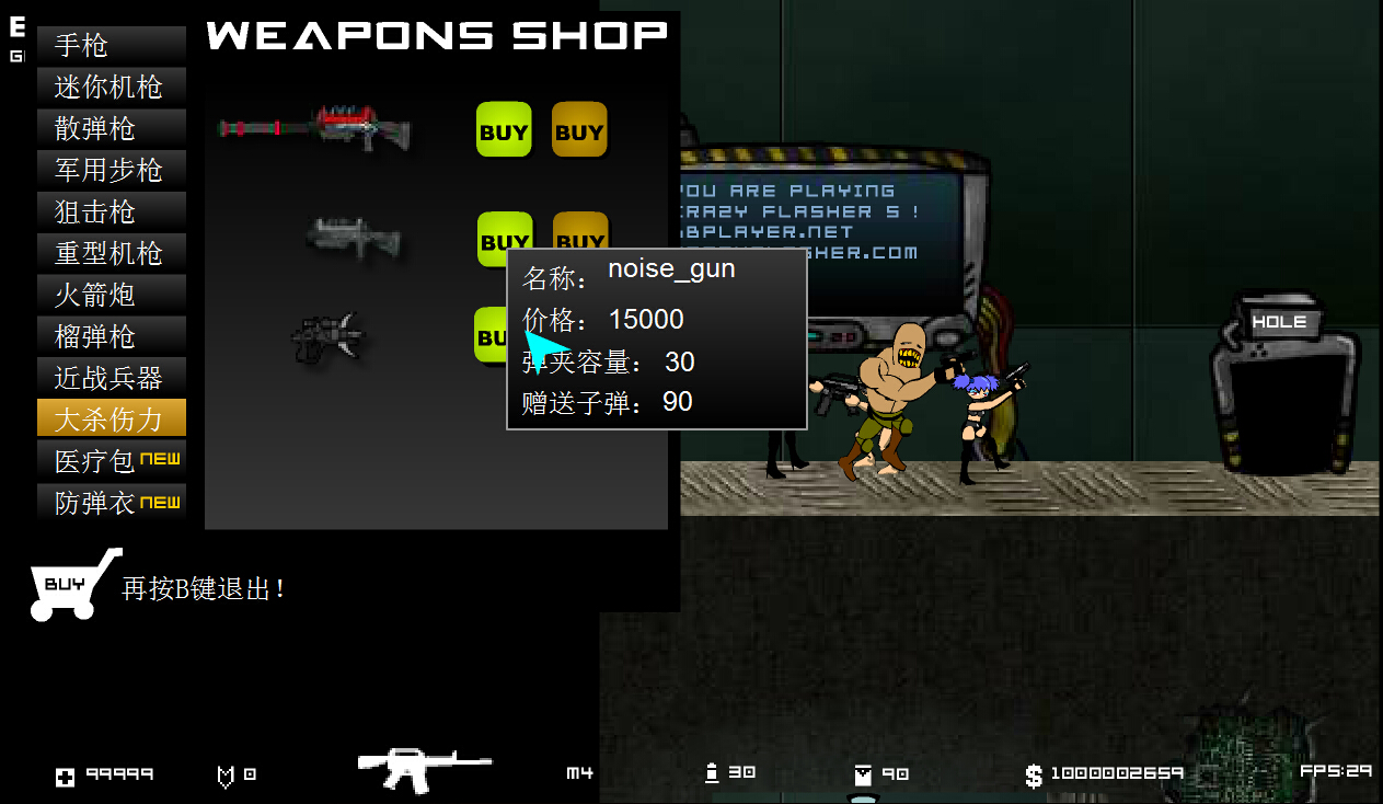 迷你机枪 迷你机枪的子弹数比手枪多得多,是一种携带轻便的连发枪种,适合连射对付小兵和近战敌人,价格不贵,但对付强大敌人还是不行。p90子弹较多,适合当做备用武器。