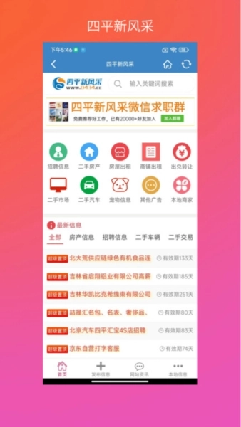四平新风采,是四平市新风采广告有限公司专门为四平地区民众精心打造的综合服务软件。这款软件汇聚了众多实用功能,能助力用户轻松解决各类生活难题,像招聘资讯、二手房产信息、房屋出租消息、二手交易市场动态以及商铺出租详情等,全方位助力您在四平的生活更加便捷。借助该软件,用户能够浏览到最新发布的帖子,及时知晓四平各个方面的情况,真正实现足不出户就能找工作、找房子,还能寻觅到与自己兴趣相投的圈子,为您的生活增添更多精彩。感兴趣的用户,赶紧点击体验吧!