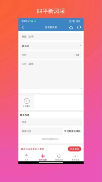 开启四平新风貌,在页面底部寻觅「发布信息」按钮,挑选相应分类,便可发布信息。