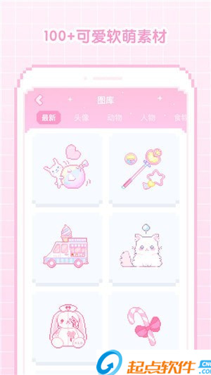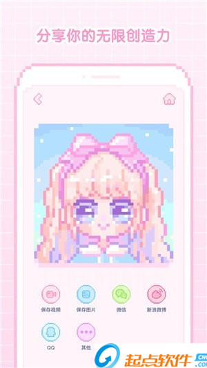 录制填色创作过程,生成视频分享到社交平台;并且像素少女软件定期更新填色素材,每周都有新鲜感;生成像素格子头像,实用又可爱~~~