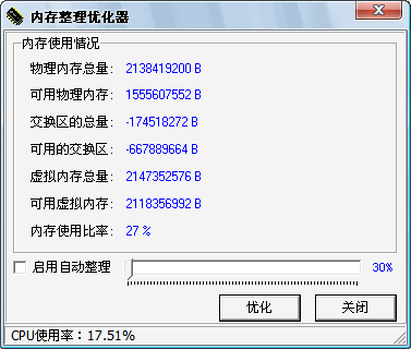 是一款极好的内存整理优化工具,能够在不影响系统速度的情况下有效的释放内存,进行内存的优化整理。它不但能够让用户按照需要随意调整所要整理的内存范围,同时更具有强大的自动整理功能,您可以自由设置自动整理的比率