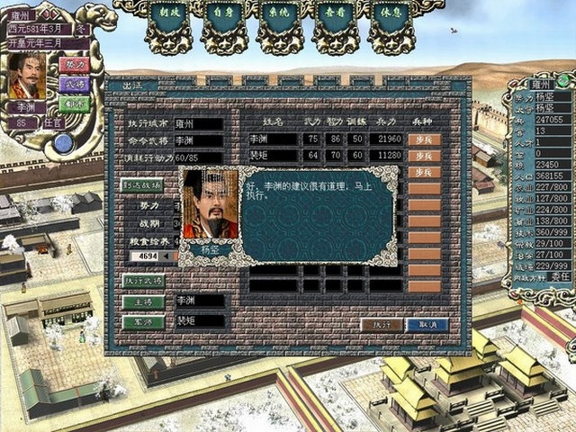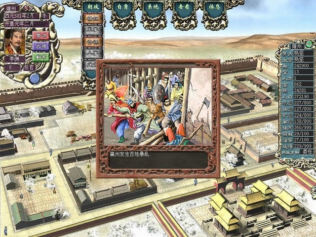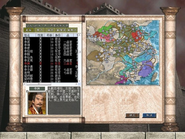 在这里面发现一个很不爽的地方,就是那些隋唐前几名的好汉,都很小,因为只有一个581年开场的剧情,所以没法选择这些人来玩,而且这里武力高的人,基本不懂“旋涡”和“火牛冲”的计谋,电脑偶尔也不傻,武力值相差太多的,“单挑”电脑一般都会拒绝PK。