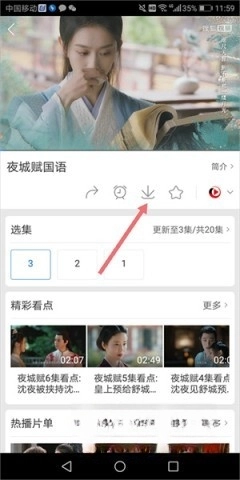 1、于电视剧播放页面,点击播放画面下方的图标(具体位置参照下图红色箭头所指区域)。
