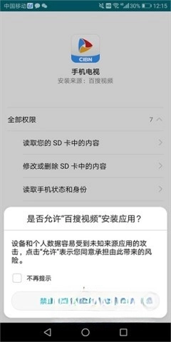 3、当点击播放按钮,系统会弹出提示,要求安装【手机电视】软件,待安装完毕,就能正常观看电视直播。