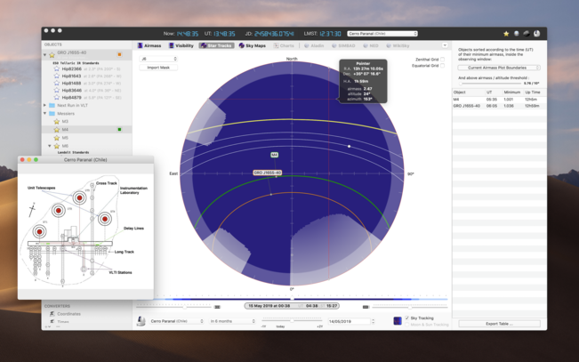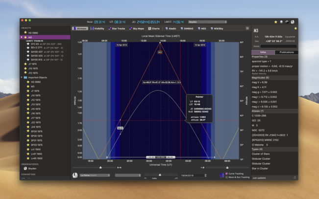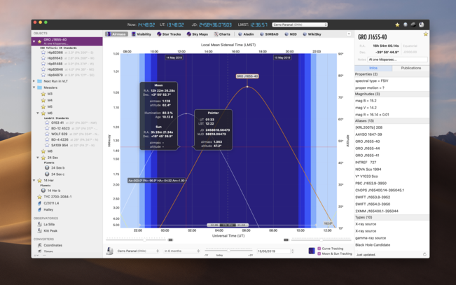 轻松导入任何已知或未知Simbad对象,浏览目录或下载任何已知的系外行星彗星和小行星的新JPL星历。所有对象的参数、性能和引用将自动保持最新。绘制和跟踪约100内建的观测地球上多种颜色的气团曲线,得到物体根据最佳观测时间排序,
