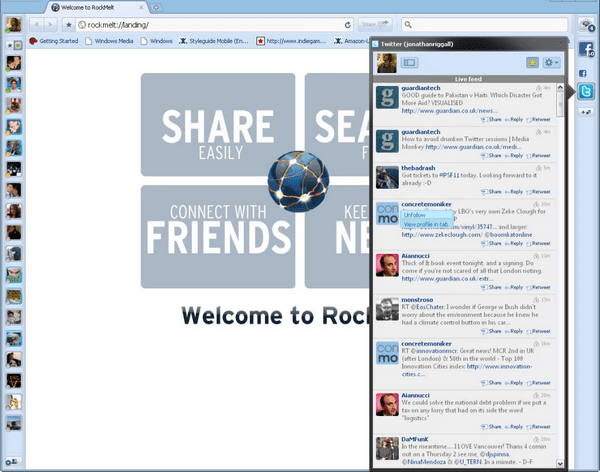 RockMelt 与 Chrome 的使用习惯完全相同,习惯 Chrome 的同学很容易上手的。另外 RockMelt 的安装及使用都需要登录 Face book,需要特殊方式连接,你懂的。相比于中国互联网混乱且流氓的 IE 壳浏览器大战,RockMelt 则能给人更加互联网的感觉,让你在使用浏览器的过程中将 SNS 融入其中。可能在国内大多数人都无法正常使用 RockMelt,但这不是重点,希望能给开发者带来灵感。【功能介绍】