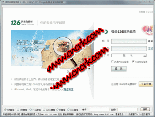 通用邮箱登录器 V1.1 简体中文绿色免费版 通用邮箱登陆器是一款多款邮箱登陆。支持qq.163.126.yeah.雅虎.新浪等邮箱,自动储存帐号密码,再次打开可直接使用!这样就方便了每次进去邮箱还要打开网页再输入密码的困扰,这款软件决对大大节约了用户时间,方便快捷的软件.