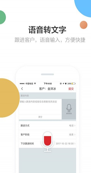 记录客户跟进全过程,语音转文字录入拜访记录,总结拜访成功经验。