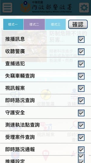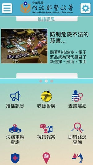 服务据点、酒驾防制、入山申请、警广招领遗失物、警广协寻遗失物、警广协寻失车、警广协寻失踪人口、关于法律、多国日常问候语。