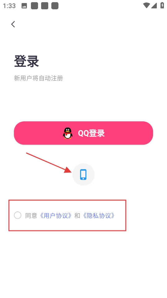 2、于登录页面勾选协议,并选择手机登录方式。