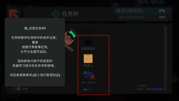 9、当从网友处获取任务后,找到任务树并进入其中。任务树记录着你在游戏中的进展情况,垂直方向的进度对应故事任务,水平方向的分支则为可选项。而图标颜色表示任务中所运用的不同类型机器学习技术。
