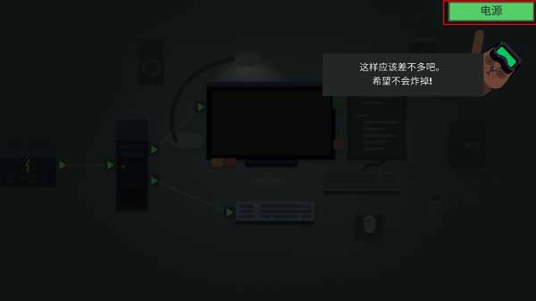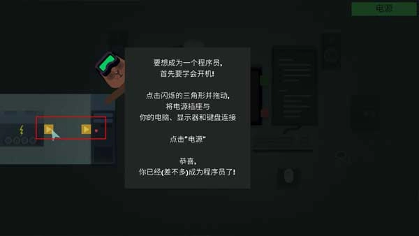 2、首先要做的是开启电源。找到闪烁的三角形,按住并拖动它,把电源插座与电脑、显示器以及键盘相连,随后点击“电源”,就能开启电脑。