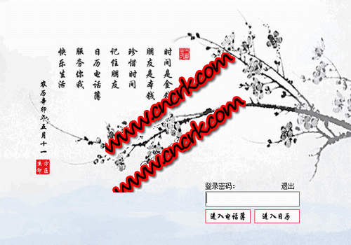 时间是金钱,朋友是本钱,珍惜时间,记住朋友,日历电话簿,服务你我,快乐生活!我们把日历和电话簿放到一起,目的是让您在最短的时间内,用最快捷的方式找到并管理您的生活中最常用的两个信息。