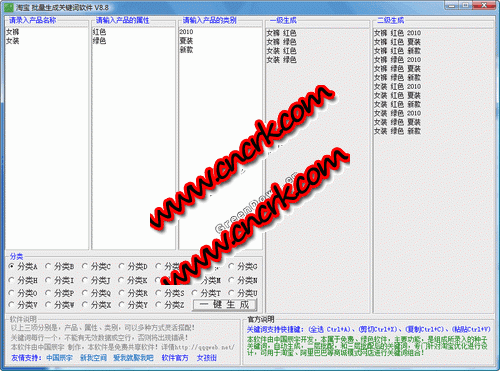 淘宝关键词批量生成工具软件为免费、绿色、免安装软件,主要功能是,淘宝宝贝关键词、淘宝直通车关键词批量生成,可以设置多个分类,产品,类目,批量生成淘宝优化关键词。
