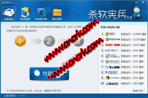 杀软宪兵 V1.3.0.0 绿色免费版 杀软宪兵是一款帮助您选择杀毒软件的辅助工具,轻松三步操作,帮您检测杀毒软件对系统性能消耗情况.用于对杀毒软件拖慢电脑进行公开、中立的评测,力图以最简单的方式给大家在选择最适合自己的杀毒软件。目前有70%以上的用户都在抱怨自己的电脑慢、电脑卡,而这其中有很大一部分就是杀毒软件造成的,杀毒软件已经成为拖慢系统资源的罪魁祸首。
