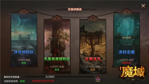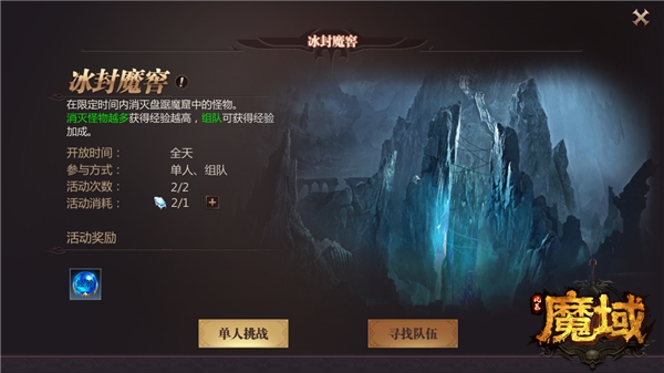 冰封魔窟也是玩家快速获取经验的重要途径,冰封魔窟副本每日可以挑战两次,不论单人还是组队都可以进入战斗。但玩家想要经验最大化,还是需要组队进行战斗。副本中组队可以获取高额经验加成,再搭配上经验药水的加成,冰封魔窟可获取经验的数值也是非常可观的。