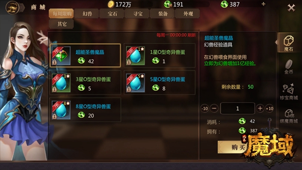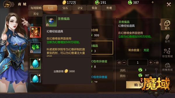 圣兽魔晶最快速的获取方法是商城,玩家可以利用魔石在商城中直接购买。商城中的魔晶分为圣兽魔晶和超能圣兽魔晶,圣兽魔晶可以让宠物获取500万经验,超能圣兽魔晶可直接增加幻兽1亿点经验。购买的价格比较亲民,所有玩家几乎都能轻易购买。