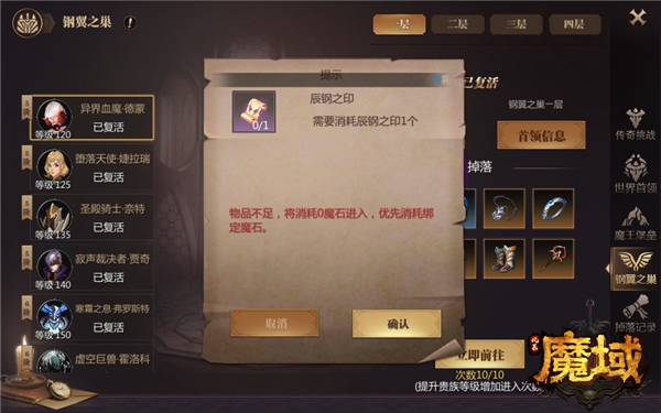 钢翼之巢共分4层,BOSS的强度随着层数的增加而递增,掉落的物品包括各等级、品质的装备、经验丹、觉醒石等,玩家可从副本界面查询到每个BOSS的掉落物品。不过,副本每天只提供10次的参与机会,并且需要花费一定数量的魔石或者钢翼之印。刷本过程中,击杀怪物或者停留都会增加神罚值,一旦神罚值达到100便会强制传送出去。