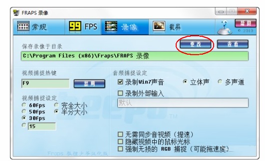 2、在fraps简体中文版中选择保存录像的位置,由于文件较大,建议不要装在C盘,更换位置,点击更改。